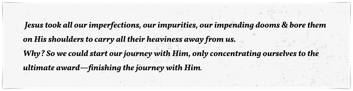 - By His death on the cross, our wretchedness was hung there. Our impurities, imperfections, worries, etc., were unloaded, and we were set free to run, to fly into His final destination.