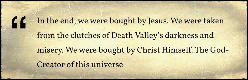 - In the end, we were bought by Jesus. We were taken from the clutches of Death Valley’s darkness and misery. We were bought by Christ Himself. The God-Creator of this universe