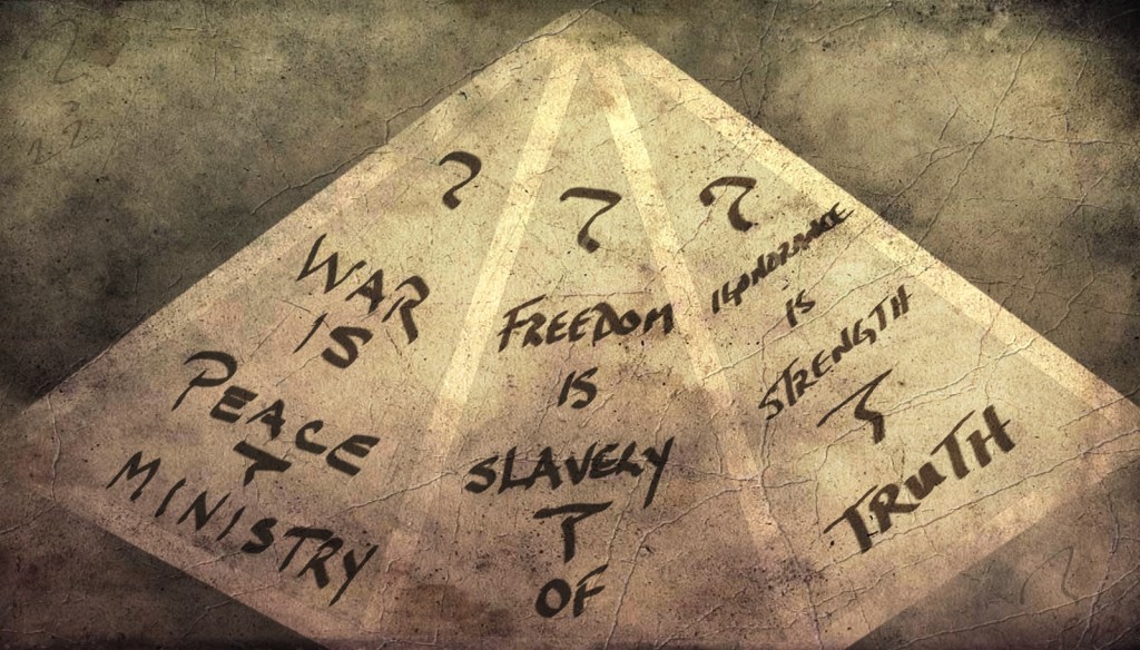 The Ministry of Truth was startling different from any other object inside. It was an enormous pyramid structure of glittering white concrete, soaring up, terrace after terrace, 300 meters into the air. From where Winston stood it was just possible to read, picked out on it’s white face in elegant lettering, the three slogans of the Party: